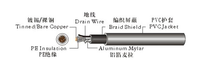 Drain wire is between Aluminum Mylar and Braid shield